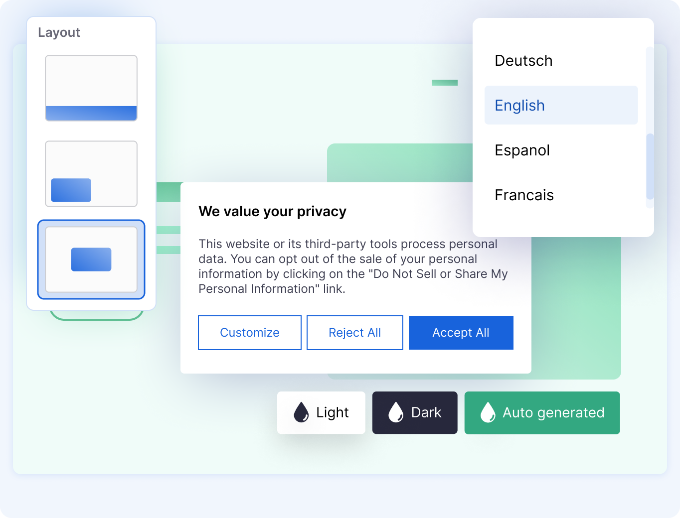 - Teema: Valitse joko vaale (Light) tai tumma (Dark) teema riippuen siitä, kumpi sopii paremmin sivustosi värimaailmaan.
