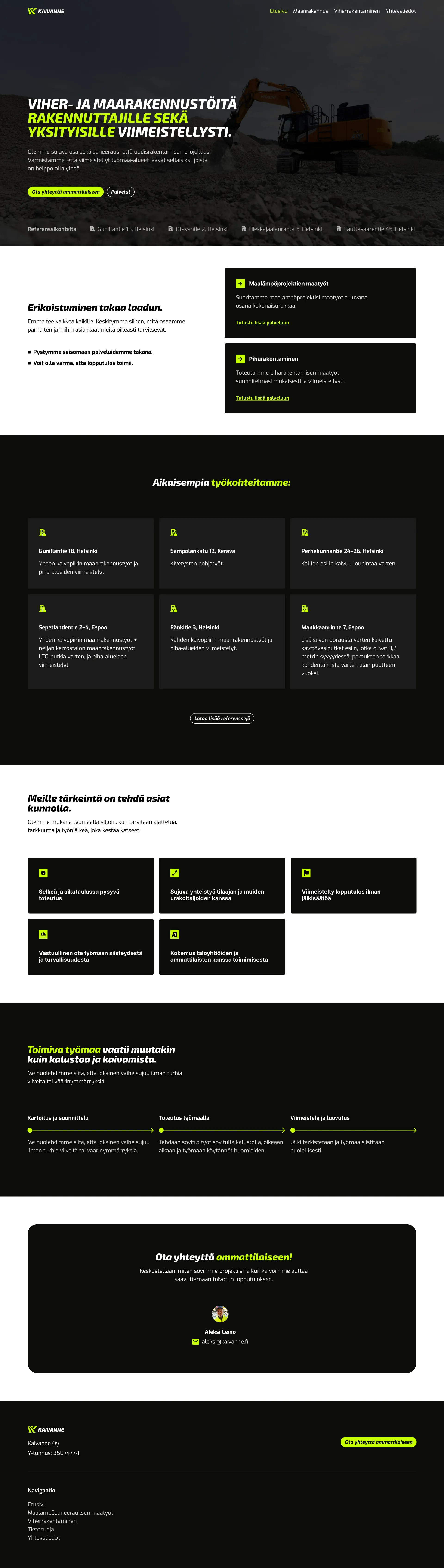 Hoidimme kokonaisuuden kuntoon: palvelusisällöt, prosessikuvaukset ja asiakaskeissit madaltamaan yhteydenottokynnystä. Visuaalinen ilme rakennettiin selkeän idean varaan – työmaan tummuus ja harmaus yhdistettynä työliivien neonvihreään, joka toi tunnistettavuutta ja persoonallisuutta.
